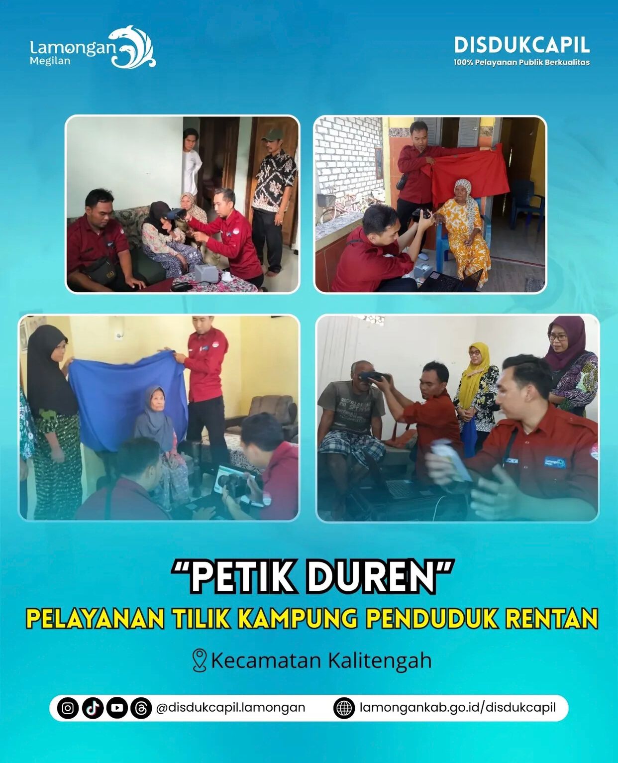 Lamongan – Upaya menghadirkan layanan administrasi kependudukan yang mudah dan merata terus dilakukan oleh Dinas Kependudukan dan Pencatatan Sipil (Disdukcapil) Kabupaten Lamongan. Melalui program Petik Duren (Pelayanan Tilik Kampung Penduduk Rentan), tim Disdukcapil kembali turun langsung ke lapangan dan kali ini menyapa warga di Kecamatan Kalitengah pada Kamis, 16 Oktober 2025.